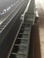大倾角尼龙挡边带, 是由基带、挡边、横隔板3部分组成。挡边起防止物料测滑撒落的作用。为便于绕过滚筒,档边设计成波纹状;横隔板的作用是承托物料,为了实现大倾角输送,采用T型TC型。档边和横隔板是用二次硫化的方法与基带连接的,具有很高的连接强度。用于输送易散落的粉状、粒状、小块状、糊状及液态状物料。其特点:适用于倾角0°~90°散装物料的输送;具有使用范围广、占地面积小、无转运点、减少土建投资、维护费用低、维修容易输送量大连续化、高效率、大倾角运输,操作安全,使用简便,,运费低廉,并能缩短运输距离,降低工程造价,节省人力物力等特点;解决了普通带和花纹带所不能达到的输送角度;还可根据使用环境,设计成完整、独立的输送系统,避免了间断输送和复杂输送的提升系统。可沿水平、倾斜、垂直和变角方向输送各种散装物料,从煤、矿石、沙子到化肥和粮食等。物料粒度不限,可从很小的粒度到400mm的大粒度,输送量可从1立方米/小时到6000立方米/小时。