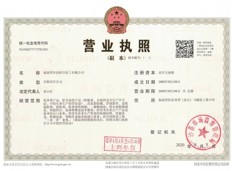 • 松香类产品,松节油类产品(暂歇业、未取得安全生产许可证,不得从事生产经营活动)、高炭脂肪酸、浮油沥青,造纸施胶剂、胶粘剂、松香改性树脂、二来酸制造,塔尔油精制造、热能供应、设备维修及技术服务,经营不企业自产产品及技术的出口业务;经营本企业生产所需的原辅材料、仪器仪衣、机械设备、零配件及技术的进口业务,经营进料加工和二来一补”业务。(依法须经批准的项目,经相关部门批准后方可开展经营活动)